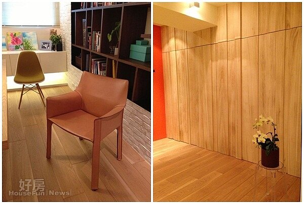 家中的許多傢俱,都是夫妻倆親自挑選的(左),為了與木質地板搭配,客廳一角的牆壁也鋪上木板(右)