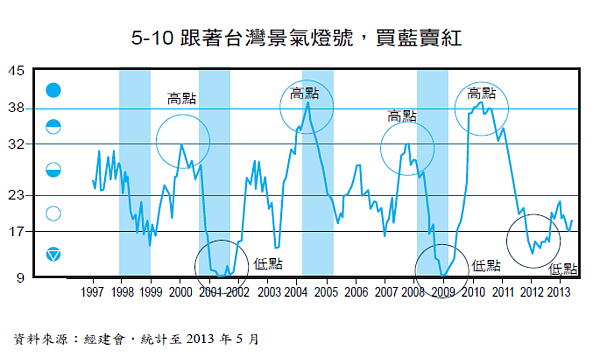 2013年5月台灣仍處在景氣黃藍燈區,但搭配領先指標與今年經濟成長率來看,景氣應可逐步走高,投資人可加碼股票,迎接未來景氣行情來臨。