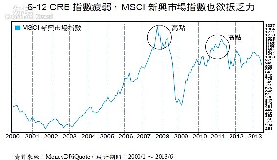 由於新興國家是原物料出口國,也是原物料的需求國,因此,新興國家股市走勢與原物料較為一致。例如2009年到2010年原物料反彈行情中,MSCI新興市場指數表現也相當亮麗,但自2011年起原物料下跌,新興市場的表現就相當疲弱。相較於美股已經突破2007年高點,新興股市與CRB走勢相似,距離前波高點,還落後一段距離呢。