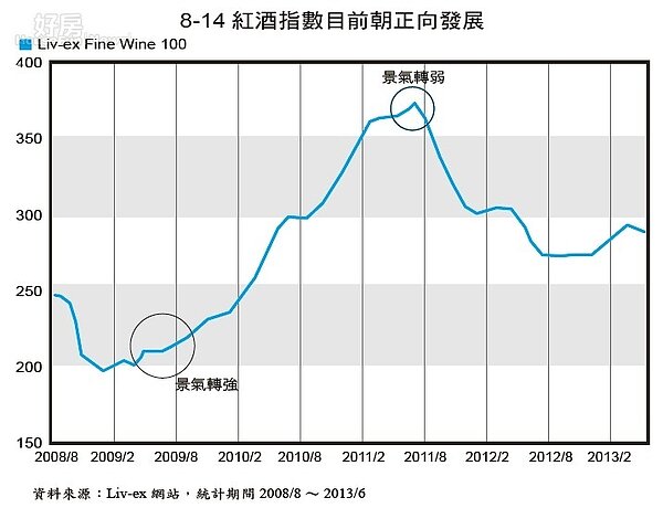 雖說有錢人較不受經濟景氣影響,但從紅酒價格指數來看,似乎不盡然。因為紅酒的價格波動,近年來確實與景氣波動亦步亦趨。例如在2008年受全球景氣下滑影響,紅酒指數也下跌,而2009到2010年則呈現強勁走勢,但2011年後的紅酒指數又呈現下跌走勢,直到2012年11月之後才出現回升走勢(參圖8-14)。