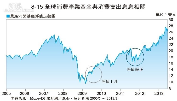 若對照一檔全球消費產業基金走勢,2008年上半年紅酒指數從高檔下跌,景順消閒基金的走勢也逐漸下滑,而到2009年初紅酒指數開始回升後,消閒基金的走勢也回升。其中,2011年5月之後,消費動能雖然減緩,基金走勢也有小幅度修正,不過之後基金走勢再創新高,表現與美股走勢一致。未來若全球消費動能增強,消費產業基金應該還有持續上漲空間(參圖8-15)。