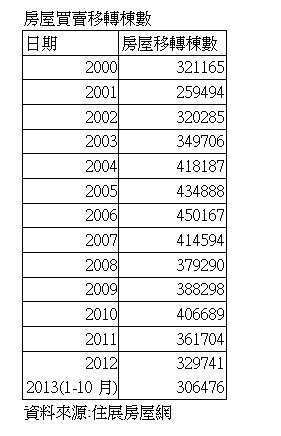 不過,2013年1到10月房屋移轉棟數為30.6萬戶,以此推估,全年有可能超過36萬戶,高於去年的水準,房市成交量呈現回溫走勢。可是,台灣經濟景氣至今仍停留在黃藍燈,今年經濟成長率還大幅下修至1.7%,房市交易回溫與景氣情勢難以連結,也許與奢侈稅二年期滿,部分投資人開始售屋,以及預售屋交屋有關。