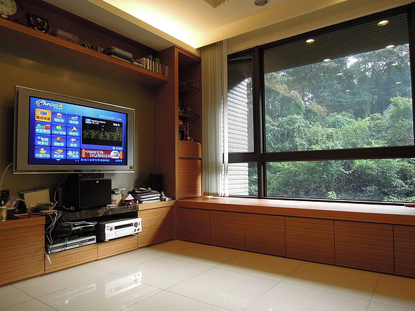 大安硯的大坪數隔局是一廳四房,Andy並沒有做更動,客廳、書房、主臥室統統有大片窗戶面對公園森林,女兒和母親的房間也有大窗戶,面對中庭,主臥的衛浴當然也開窗,而且是面對樹林,「反正樹林裡除了蟲鳥就沒人,所以洗澡、上廁所,都不必拉窗帘。」另一個小衛浴也有窗戶,面對的是陽台,「這個房子最讚的地方就是窗窗窗窗,採光、通風都很棒。」