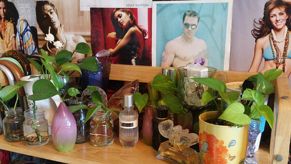 ↓除了0元的雜誌牆,牆前鞋架上用雞精罐、果醬罐與破角馬克杯養的許多黃金葛,也是不花錢又能提升居家美感的小道具